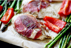 Place peppers and asparagus in a bowl and drizzle with olive oil OR melted coconut oil and toss. Open each heart. On one side of each heart, divide the asparagus and red pepper among the four parchment paper packs. Season with salt and pepper. Place one prosciutto wrapped chicken breast on top of each vegetable stack and seal each packet.